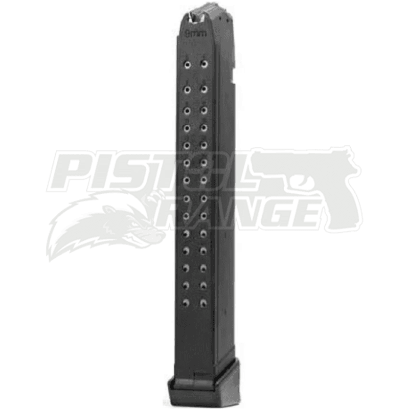 Magazynek do pistoletu Glock -pojemność 31+2 naboje , kal.9mm Luger . Producent Austria. Oryginał . Pasuje do Glocka 2,3,4,5gen .( wycięcia lewe i prawe)