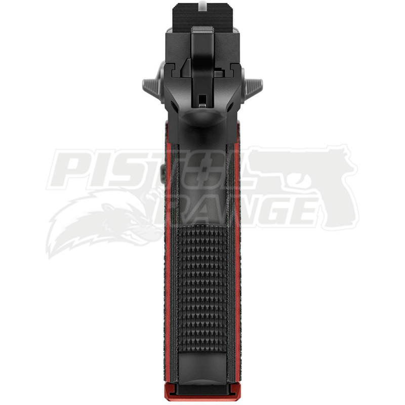Najnowsze „dziecko” czeskiego producenta czyli CZ Shadow 2 Target w wersji 5″ (jest także wersja 6″) w bardzo ciekawej kolorystycznie wersji – czarne, z czerwonymi akcentami. Broń powstała przy współpracy z Mistrzem Świata w konkurencji IPSC – Ericiem Grauffelem. Do naszej dyspozycji jest 5″, gruba, matchowa lufa przystosowana do amunicji 9×19 mm. Od razu w oczy rzucają się przyrządy od włoskiej firmy LFA – muszka oraz w pełni regulowana mikrometrycznie szczerbinka.